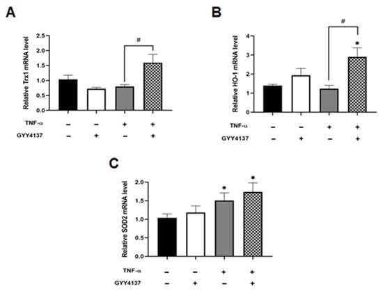 GYY4137 post-treatment increase intracellular antioxidants in TNF-α-treated cells. The extracted RNA was reverse transcribed to cDNA and calculated using the ΔΔCt value method with two duplicates and with EEF2 as a housekeeping gene. Bar graphs of relative (A) Trx1, (B) HO-1, and (C) SOD2, mRNA expression was analysed by RT-QPCR. Results were shown as mean ± SD (N = 4 independent experiments with 3 replicates in each experiment. One way ANOVA test was carried out, followed by Tukey’s post hoc test to normalise for multiple comparisons comparing treatment vs. control, whereby (* p < 0.05) compared to control. (# p < 0.05) represents a comparison to the TNF-α group alone.