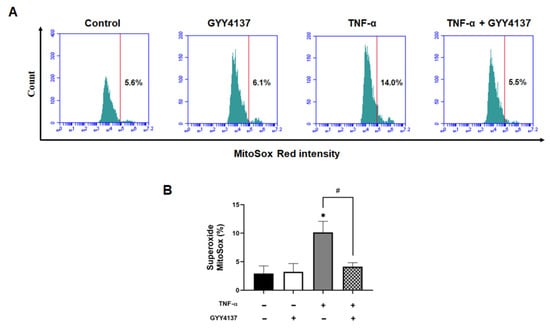 GYY4137 post-treatment reduces oxidative stress in TNF-α-treated cells. (A) Representative flow cytometry histogram plots for MitoSox intensity and (B) quantification of MitoSox fluorescence-associated superoxide intensity compared to the untreated control (positive threshold was set to 2% using unlabelled cells), using 10,000 events in each replicate p-values were calculated using one-way ANOVA followed by Tukey’s comparison test. Data are shown as means ± SD; * p < 0.05 vs. control. # p < 0.05 vs. TNF-α-treated groups only. N = 3 independent experiments with 3 replicate in each experiment.