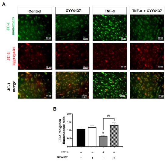 GYY4137 post-treatment prevents mitochondrial depolarisation mediated by TNF-α. (A) Representative fluorescence images showing mitochondrial membrane potential (Δψm) detected by JC-1 staining. Scale bar 10 µm. A decrease in the red (~590 nm)/green (~529 nm) fluorescence intensity ratio is indicative of depolarisation (n = 3). (B) Quantifying Δψm in the presence of TNF-α with GYY4137post-treatment in 4 fields with at least 40 cells was monitored. p-values were calculated using one-way ANOVA test followed by Tukey’s comparison test. Data are shown as means ± SD * p < 0.05 vs. control. ## p < 0.01 vs. TNF-α-treated groups only. N = 3 independent experiments with 3 replicate in each experiment.