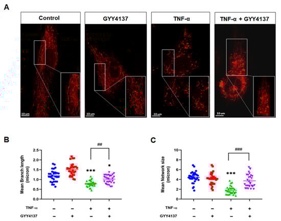 GYY4137 post-treatment prevents mitochondrial morphology changes mediated by TNF-α. (A) Mitochondria morphology was determined by Mitotracker (red staining, 100 nM) and confocal microscopy imaging (63× oil APO objective lens). Images of isolated mitochondrial networks were analysed using a publicly available ImageJ macro, MINA []. Scale bar 10 µm. (B) Mitochondria mean branch length is the average length (in microns) of all branches. (C) Mitochondria network size is defined as the average number of branches per network (in microns). p-values were calculated using one-way ANOVA test followed by Tukey’s comparison test. A total of 30 cells per treatment group per independent experiment were consolidated and measured. Data are shown as means ± SD; * p < 0.05, *** p < 0.001 vs. control. ## p < 0.01, ### p < 0.001 vs. TNF-α-treated groups only. N = 4 independent experiments with 3 replicate in each experiment.