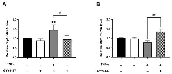 While fusion and fission dynamics are balanced under basal conditions, oxidative stress can provoke a shift towards fission, resulting in excessive mitochondrial fragmentation []. qPCR analysis shows that mitochondrial fission marker DRP1 mRNA levels were significantly increased in TNF-α treated cells compared to untreated (p < 0.01), and that GYY4137 post-treatment significantly revoked this rise (p < 0.05) (Figure 9A). Furthermore, Figure 9B shows that GYY4137 post-treatment significantly elevated mitochondrial fusion marker, MFN1 mRNA expression (p < 0.01). Taken together, these results suggest that TNF-α affects mitochondrial morphology, leading to overall smaller networks and shorter branches, whilst post-treatment with GYY4137 could improve but does not completely restore mitochondrial morphology in TNF-α treated HUVECs.