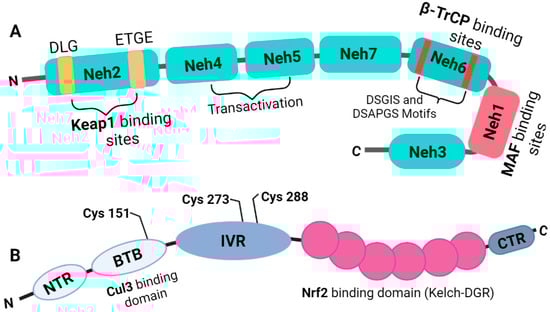 Figure 1. Illustration for Nrf2 and Keap1 Structures: (A) Nrf2 is a 589-amino acid long amino acid protein containing seven domains specific for different functions. At C terminal, Neh1 is located between Neh6 and Neh3 domains and has Maf as DNA binding sites. Neh6 has serine-rich DSGIS and DSAPGS motifs, which are degron involved in mediating Nrf2 nuclear degradation. Neh2 domain is located at the N-terminal region that provides the binding sites for Keap1. Similarly, in (B) cartoon of Keap1 is illustrated. Kelch-DGR is an Nrf2 binding domain located at the C-terminal region, while Cullin 3 binding domain (BTB) is situated at the N terminal of the protein.