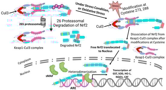 Regulation of NRF2 expression is mediated via three signaling pathways involving Keap1 (Kelch-like ECH-associated protein 1), HRD1, an E3 ubiquitin ligase involved in protein degradation [37], and E3 ligase adapter β-TrCP (β-transducin repeat-containing protein). These three proteins facilitate NRF2 proteasomal degradation by different mechanisms. As discussed above, Nrf2 has seven highly conserved domains (Neh1–Neh7) that make interactions possible with various different proteins, especially Keap1 [35]. The hydrophilic area of lysine residues (7K) in Neh2 is essential for Keap1-dependent polyubiquitination and Nrf2 degradation, and it also contains the ETGE and DLG motifs that are necessary for the interaction with Keap1 [31,38], whereas, the Keap1 has five domains and 624 amino acid residues. The intervening region (IVR) lies between the BTB and the Kelch domain, two protein–protein interaction motifs. The BTB domain and IVR’s N-terminal region work together to homodimerize Keap1 and connect to Cullin3 (Cul3) [39]. Cul3 is the core protein of the E3 ubiquitin–protein ligase complex, which facilitates target protein ubiquitination and proteasomal breakdown [39]. The interaction with Neh2 is mediated by the C-terminal region and the Kelch domain. With 27 cysteines in human protein, Keap1 has a high concentration of cysteine residues [40,41,42,43]. According to the “hinge and latch” model, the dimer of two keap1 molecules interacts with Nrf2 [44]. Thus, under basal conditions, the Nrf2 protein is tightly controlled by the Keap1–Cul3–E3 ubiquitin ligase complex to keep Nrf2 at its low level. Moreover, another recent research has revealed that the deubiquitinating enzyme USP15 also plays a significant part in controlling the ubiquitination and degradation of Nrf2 [45]. Keap1 is deubiquitinated by USP15, which also stabilizes and improves the E3 ligase activity of the Keap1–Cul3–E3 complex [39,45]. As a result, Nrf2 is eventually degraded. However, under induced conditions or oxidative stress, the controlling activity of the Keap1–Cul3–E3 ubiquitin ligase complex is impaired, and Nrf2 level increased [45]. Keap1 has been hypothesized to release Nrf2 by covalent modifications of the crucial cysteine residues (Cys-151, Cys-273, and Cys-288), since it is a thiol-rich protein and is therefore sensitive to an electrophile [46]. In other words, post-translational modifications in cysteine residues lead to the dissociation of the Cul3-based E3 ligase complex from Keap1. This dissociation helps prevent the proteasomal degradation of Nrf2 and leads to Nrf2 stabilization [47]. After dissociation, Nrf2 accumulates in the cytosol, then translocate to the nucleus, although the de novo generated Nrf2 was also found to accumulate in the cytoplasm and migrate into the nucleus rather than detaching from Keap1 (Figure 2) [48]. In the nucleus, sMaf binds to Nrf2 and forms a heterodimerized form that can recognize and bind to the ARE sequences of various antioxidant enzymes (such as NAD(P)H quinone oxidoreductase 1 (NQO1), glutathione S-transferases (GST), superoxide dismutase (SOD), and heme oxygenase 1 (HO-1), etc.) and promote their expression to cope with oxidative stress [49].