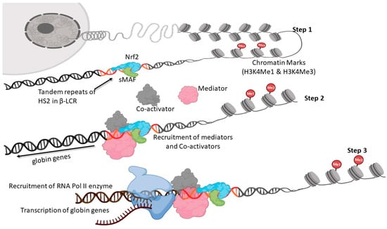 Figure 3. Illustrations show stepwise deciphering of how the heterodimer of Nrf2-sMAF in the nucleus mediates the transcription of globin genes accordingly, after binding at the regulatory sequence of the gene. For globin gene expression, heterodimer of Nrf2 with sMAF binds to the tandem repeats of hypersensitive site 2 (HS2) in β-LCR (β-locus control region). This heterodimer of Nrf2 with sMAF recruits coactivators and mediators to the site and makes the chromatin structure accessible to the RNA polymerase II (Pol II) enzyme. Thereafter, Pol II and general transcription factors (not shown in the illustration) are recruited to transcribe the globin genes.
