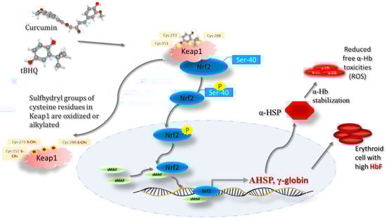Figure 4. Since the Keap1–Nrf2 interaction is the most crucial part of this signaling, and for Nrf2 to play a cytoprotective role, it must be dissociated from Keap1 in response to oxidative stress. Various (natural and synthetic) molecules involved in Keap1–Nrf2 dissociation have been proposed because of their electrophilic properties. These molecules directly interact with some specific cysteine residues on Keap1; as a result, sulfhydryl groups on cysteines are either oxidized or alkylated (only alkylation is illustrated in the figure), leading to Nef2 dissociation from Keap1. It is also reported that tBHQ/curcumin phosphorylate Nrf2 at Serine-40. Subsequently, Nrf2 translocates to the nucleus, where it heterodimerizes with sMAF and increases the expression of both AHSP and γ-globin. AHSP is involved in the stabilization of free alpha-hemoglobin and helps reduce the free alpha-Hb-generated oxidative stress. On the other hand, the level of HbF is also reported to be high in primary human erythroid cells due to higher expression of γ-globin gene.