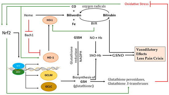 Further, Belcher et al., observed the beneficial effects of carbon monoxide (CO) in reducing sickling of erythrocytes in a mouse model of SCD [104]. Inhaling CO also reduced vascular stasis in animal models of SCD [104,105,106]. CO was, in addition, reported to be directly involved in anti-inflammatory and antioxidant actions along with the stimulation of heme oxygenase-1 (HO-1) enzyme in SCD [104]. HO-1 is an antioxidant and anti-inflammatory enzyme primarily involved in the catalytic cleavage of heme and its conversion into biliverdin, CO and iron cations [104]. Along with preventing HbS polymerization and sickling, and vaso-occlusion, CO is thought to play a role in enhancing the expression and activity of HO-1 as a positive feedback protective mechanism against hypoxia as well. CO can cause increases in nuclear Nrf2, which promotes HO-1’s expression and activity, together with decreases in NF-ĸB activation and the expression of adhesion molecules such as P-selectin and von Willebrand factor (VWF) [104,107]. In addition to CO, biliverdin produced by HO-1 converts into bilirubin by biliverdin reductase (BVR). Bilirubin has vasodilating properties. Bilirubin can also reduce oxygen species by scavenging the reactive oxygen. Bilirubin, when reacting with oxygen species, is converted back to biliverdin [108]. The HO-1-derived biliverdin lessens the angiotensin II-mediated vascular damage by inhibiting the activities of NADPH oxidases and protein kinase C (PKC) [109]. We therefore hypothesize that Nrf2, by inducing HO-1, may also have vasodilatory effects via biliverdin (Figure 5). To additionally evaluate the role Nrf2 in SCD, scientists have recently observed reduced inflammation, and mRNA expression of the proinflammatory cytokines, tumor necrosis factor (TNF)α and interleukin (IL)1β, using the Cre-recombinase system [110]. They found that Nrf2 activation in monocytes/granulocytes, and endothelial cells ameliorates the pathophysiology of SCD, suggesting that targeting Nrf2 activation could be a plausible therapeutic approach to ameliorate SCD pathology [110]. We also suggest that MiRNA-based research may further support the notion of targeting Nrf2 therapeutically for the management of SCD severity. It has been identified that miRNAs (miR-153, miR-27a, miR-142-5p, miR-144, miR-28, and miR-34a) are involved in the reduced expression and activity of Nrf2 in various diseases [111]. Similarly, miR-144 was evidenced to be highly expressed among the most severe phenotypes in SCD patients [112].