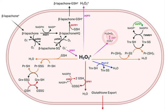 Generation of a relevant model of drug metabolism and hydrogen peroxide clearance pathways. The metabolism of β-lapachone by NQO1 results in the generation of superoxide (O2•−) and the oxidation of NADPH. Superoxide dismutase 1 (SOD1) in the cytosol converts the superoxide to hydrogen peroxide (H2O2) which is converted to water and oxygen by antioxidant systems including the peroxiredoxin/thioredoxin/thioredoxin reductase/sulfiredoxin system, the glutathione peroxidase/glutathione/glutathione reductase system, catalase, and the oxidation of free protein thiols. NADPH often serves as the reductant for cycling these antioxidant enzymes and is used to reduce β-lapachone, thus, canonical metabolic reactions involved in the production of NADPH are also included, such as glucose−6-phosphate-dehydrogenase (G6PD). Intermediate protein oxidation steps not shown in the diagram.