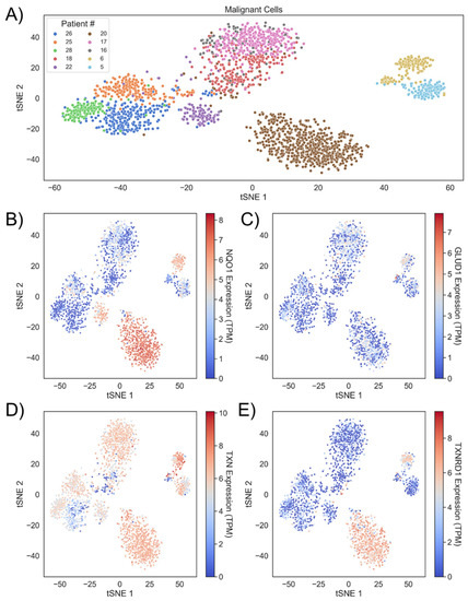 Head and neck cancers demonstrate intratumor and intertumor redox heterogeneity. (A) Malignant cells from 10 HNSCC patients cluster together based on redox profiles. Patients are identified by the numbering used in the source data (GEO Accession: GSE103322) (B) Clusters colored by NQO1, (C) GLUD1, (D) TXN, and (E) TXNRD1 expression.