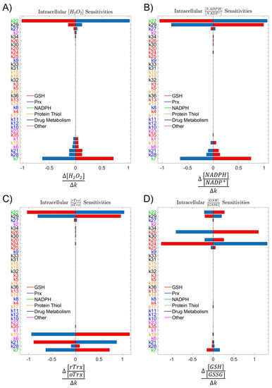 Sensitivity analyses. (A) Analysis of system sensitivity to single-parameter 10% perturbations colored by the antioxidant subsystem showed low sensitivity of (A) intracellular H2O2, (B) NADPH:NADP+, (C) Trx-SH:Trx-SS, and (D) GSH:GSSG at 2 h to any single parameter. Blue bars represent an increase in the parameter by 10%, and red bars represent a decrease in the parameter by 10%.