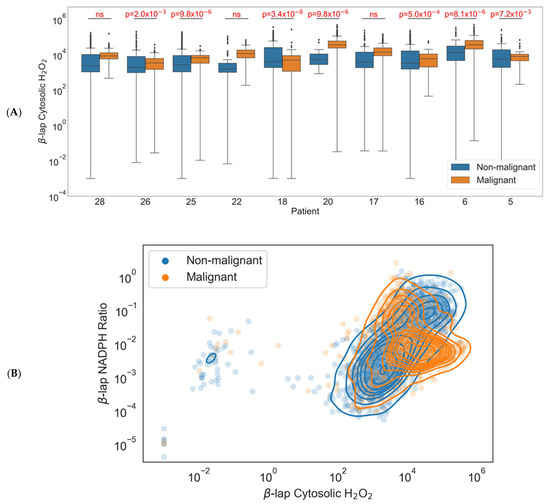 Model results using single-cell gene expression values. (A) Differences between cytosolic H2O2 in healthy and malignant cells under β-lapachone by patient. Boxes are defined by the interquartile range (IQR) with the line inside representing the mean. Upper whiskers are defined by adding 1.5 times the IQR to the third quartile, and lower whiskers are defined by subtracting 1.5 times the IQR from the first quartile. Black diamonds represent outlier samples outside the whiskers. (B) Differences between the NADPH:NADP+ ratio and cytosolic H2O2 in healthy and malignant cells under β-lapachone.