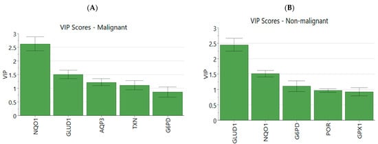 Cytosolic NADPH redox ratio after a 2 h simulation was used as the dependent Y-variable in partial least squares regression to probe the correlations between the protein concentrations within the model and the output variable. With four and three components, respectively, both the malignant and non-malignant regression models were able to achieve both high explained output variance (non-malignant R2Y = 0.891, malignant R2Y = 0.871) and goodness of prediction (non-malignant Q2 = 0.886, malignant Q2 = 0.858). VIP scores identified NQO1, GLUD1, AQP3, TXN, and G6PD as the most important variables in the malignant model (Figure 5A) and GLUD1, NQO1, G6PD, POR, and GPX1 as the most important variables in the non-malignant model (Figure 5B). An interesting result was that GLUD1 had a higher VIP score in the non-malignant cells than NQO1 did, indicating that the outcome of drug treatment in non-malignant cells was more dependent on the production capacity of NADPH than the expression of the NADPH-reducing enzyme involved in drug metabolism.