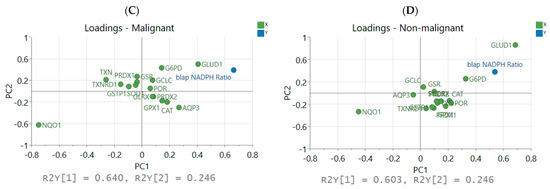 Collectively, the distribution of redox enzymes across principal components 1 and 2 differed between the two statistical models (Figure 5C,D) but there were several similarities. The distribution of NQO1 and CAT loadings in latent space reflected prior reports of NQO1/CAT not correlating well with LD50 values of β-lapachone across a diverse HNSCC panel [22]. Additionally, the importance of AQP3 in the malignant model demonstrated the impact that diffusion of H2O2 across the cell membrane can have on the oxidative stress within a cell. Anticorrelation with the thioredoxin/peroxiredoxin component to H2O2 clearance was reflected by negative PC 1 scores in the malignant model. NADPH-producing enzymes GLUD1 and G6PD and the main drug-metabolizing enzyme NQO1 were most correlated with NADPH ratios, and most other antioxidant enzyme expression levels were less important due to low magnitude of their loading weights, i.e., proximity to the origin (Figure 5C,D).