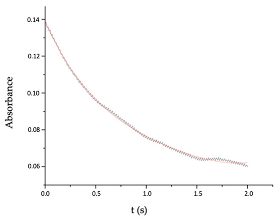 The collected absorbance-time data are fitted to a four-degree polynomial [30] and analyzed statistically in the Origin2019b program (OriginLab Corp., Northampton, MA, USA). The fittings were made for at least 2 s of the absorbance data against the reaction time of the kinetic experiment, obtaining about 40–50% of the reaction. For example, Figure 1 shows absorbance/time data for the p-hydroxybenzaldehyde reaction, these data were fitted to Equation (1) (red line) (r = 0.9989)