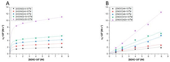 Benzaldehyde (BZH) is a substance mainly used as a food supplement because of its organoleptic activity, such as cinnamon flavoring. Moreover, this product presents a high level of antioxidant activity [1,2]. Peroxynitrite (HOONO/ONOO−) is present in cells and animal tissues. Its formation is mainly observed in canned meats, fruits, and vegetables due to anaerobic conditions. Thus, peroxynitrite can not only act as an antioxidant but also as a pro-oxidant [3,4]. Both compounds can react with each other when they meet. Then, peroxynitrite would oxidize the aldehyde present in food or food additives, thus altering their physicochemical properties. The control of these degradation/oxidation processes is therefore of great interest to the food industry. The obtained reaction products show, depending on the concentration, high levels of toxicity.