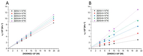 Influence of peroxynitrite concentration on the initial reaction rate. Experimental conditions: I = 0.1 M, T = 25 °C, (A) pH = 2, (B) pH = 11.2.