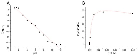 Although a straight line is observed when plotting log v0/pH in acidic media, the slope presents a value of −0.347 ± 0.001 (r = 0.9771), and the specific catalysis is not considered because the slope differs greatly from −1.