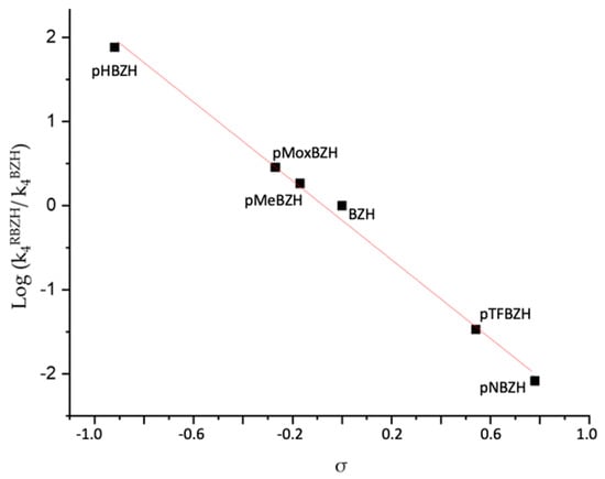 The obtained Hammett parameter value was −2.34 ± 0.01 (r = 0.9951). Negative values imply that a positive charge is being generated (or a negative charge is lost) since for benzaldehydes with donor substituents such as –OH, –OCH3, or –CH3, higher values of k4 have been obtained, while for the attractor substituents (–NO2 and –CF3) the opposite occurs. This justifies the stabilization of a positive charge in the transition bay donor substituents.