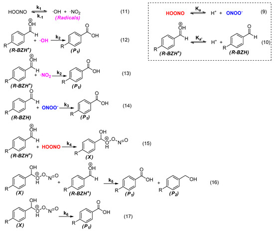 The proposed mechanism that could justify all the experimental results must consider the peroxynitrite decomposition [17] as a source of reactive species: peroxynitrous acid, peroxynitrite anion, and radical species such as ·NO2 and ·OH. Thus, these species must be considered to react with benzaldehyde.