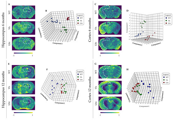 Peptide ion images and partial least-squares discriminant analysis (PLS-DA) score plots. (A,C,E,G) Representative molecular images of peptide ion detected at m/z 115,459; 96,657; 1391 and 1354, respectively. The ROIs in left and right brain sections correspond to hippocampal and cortical regions, respectively. PLS-DA 3D score plot analysis of hippocampus 6-m (B), cortex 6-m (D), hippocampus 12-m (F), and cortex 12-m (H). Results are shown as mean values of three replicates per mouse and three different mice per experimental groups, WT, Vh, and Ubi, respectively.
