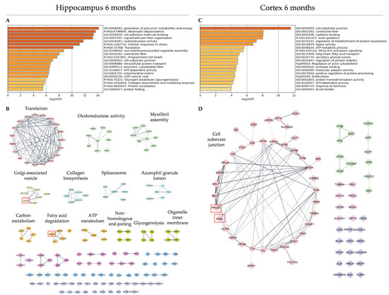 (A,C) Bar graph of the top 20 enriched terms across input gene lists, colored by p-values, in hippocampus 6 m and cortex 6 m, respectively. “Log10 (P)” is the p-value in log base 10. (B,D) Protein–protein interaction (PPI) network analysis of differentially expressed and selected genes using STRING database in hippocampus 6 m and cortex 6 m, respectively. Each module was analyzed by plug-in STRING Enrichment in Cytoscape, showing the most significative functional annotation on each case. Red-squared nodes refer to members selected for further validation.