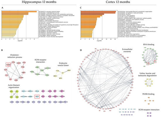 (A,C) Bar graph of the top 20 enriched terms across input gene lists, colored by p-values, in hippocampus 12 m and cortex 12 m, respectively. “Log10 (P)” is the p-value in log base 10. (B,D) Protein–protein interaction (PPI) network analysis of differentially expressed and selected genes using STRING database in hippocampus 12 m and cortex 12 m, respectively. Each module was analyzed by plug-in STRING Enrichment in Cytoscape, showing the most significant functional annotation on each case. Red-squared nodes refer to members selected for further validation.