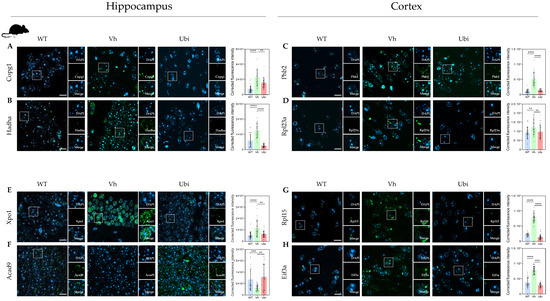 The expression of XPO1 in hippocampal regions of 12 m mice increased significantly in dentate gyrus in the Vh group compared to WT, whereas Ubi supplementation restored XPO1 expression to WT level (Figure 4E). While no differences in ACAD9 expression were found in dentate gyrus among the three groups, CA2/CA3 regions exhibited higher expression in WT and Ubi compared to Vh (Figure 4F). In cortical regions of 12 m mice, RPL15 and EIF3A expression was significantly downregulated by Ubi supplementation compared to Vh (Figure 4G,H).