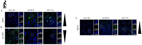 Three candidate proteins, ACAD9, EIF3A and XPO1, were assessed in human AD and healthy donors’ samples by immunofluorescence, using brain regions homologous to those studied in mice (Figure 5A–C). In addition, early (Braak stage III-IV) and late (Braak stage V-VI) AD samples were analyzed to evaluate the diagnostic validity of our markers at different stages of the disease.