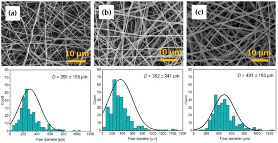 SEM images of the neat PLA/PHB/ATBC (a), PLA/PHB/ATBC + 5% oregano EO, (b) and PLA/PHB/ATBC + 5% lemongrass oil (c) fibers and matching histograms of fiber diameter distribution.