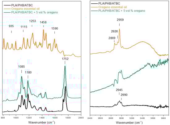 ATR-FTIR spectra of neat PLA/PHB/ATBC, oregano EO, and PLA/PHB/ATBC + 5% oregano EO nanofibrous composite.
