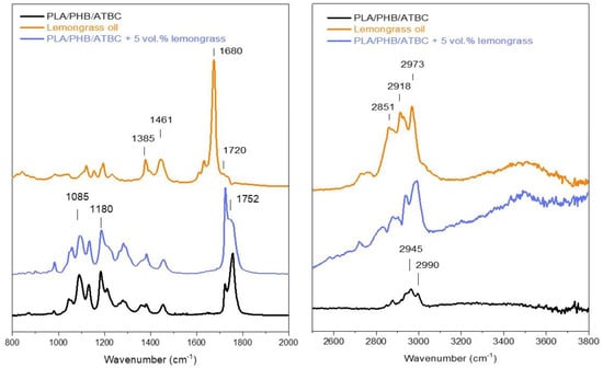 ATR-FTIR spectra of neat PLA/PHB/ATBC, lemongrass EO, and PLA/PHB/ATBC + 5% lemongrass EO nanofibrous composite.