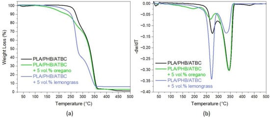 The addition of the oregano and lemongrass EOs decreases the thermal stability. The PLA/PHB/ATBC + 5% lemongrass EO is stable up to 150 °C without any mass loss. As the temperature increased, lemongrass EO degraded which is in good agreement with the available literature []. The degradation temperature in both degradation steps is reduced by about 50 °C compared to the plain PLA/PHB/ATBC. The maximal decomposition was at a temperature of around 420 °C with 5% residue.