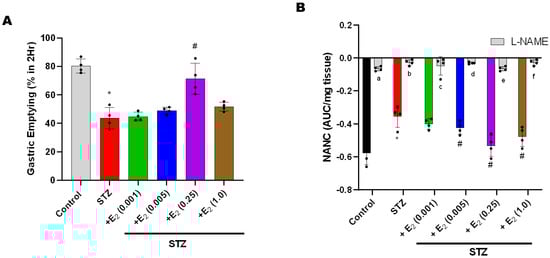 3.2. E2 Supplementation Restored Gastric Emptying and Nitrergic Relaxation in STZ-Induced Diabetic Female Mice