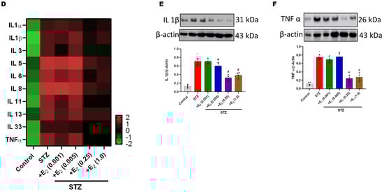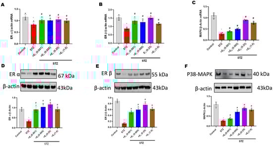 3.3. E2 Supplementation Affected ERs and MAPK mRNA and Protein Levels in STZ-Induced Diabetic Female Mice