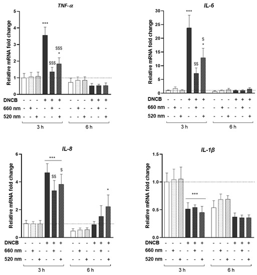 PBM regulates pro-inflammatory DNCB-induced cytokines in KCs. KCs were treated with DNCB or vehicle, with or without red (660 nm) or green (520 nm) light illumination (3 J/cm2, 250 s). Pro-inflammatory cytokines gene expression: TNF-α, IL-6, IL-8, and IL-1β, were measured by RT-qPCR 3 and 6 h after DNCB and light treatment. Results are expressed as fold change. Data represent mean ± SEM of 5 independent experiments. Two-Way ANOVA followed by Tukey post hoc test, * p < 0.05; *** p < 0.001 vs. the relative control at 3 h or 6 h; $ p < 0.05; $$ p < 0.01; $$$ p < 0.001 vs. DNCB at 3 h.