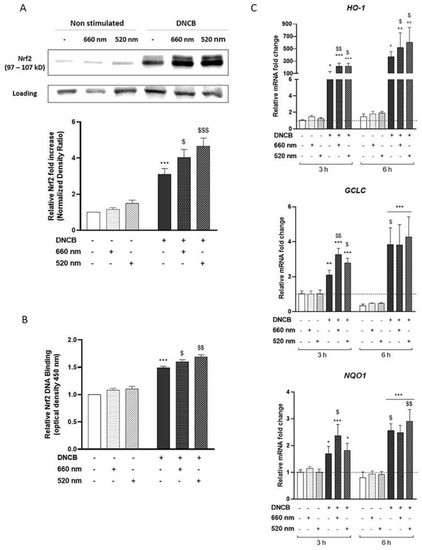 PBM enhances Nrf2-pathway activation in DNCB-stimulated KCs. KCs were treated with vehicle (DMSO 0.1%) or DNCB (25 µM) and illuminated with either wavelength: 660 nm (red light) or 520 nm (green light). (A) Nrf2 accumulation was assessed by Western blot 3 h after illumination. Histograms correspond to densitometric analysis relative to controls and are adjusted to the stain-free blot. (B) ELISA-based measurement of DNA-binding activity for activated Nrf2 in the nuclear extract, 4 h after KCs treatment. (C) Nrf2 target antioxidant gene expression: HO-1, GCLC, and NQO1, were assessed by RT-qPCR, 3 h or 6 h after light treatment. Data represent mean ± SEM of at least five independent experiments. Two-Way ANOVA followed by Tukey post hoc test, * p < 0.05; ** p < 0.01; *** p < 0.001 vs. the relative untreated control at 3 h or 6 h; $ p < 0.05; $$ p < 0.01; $$$ p < 0.001 vs. DNCB at 3 h.