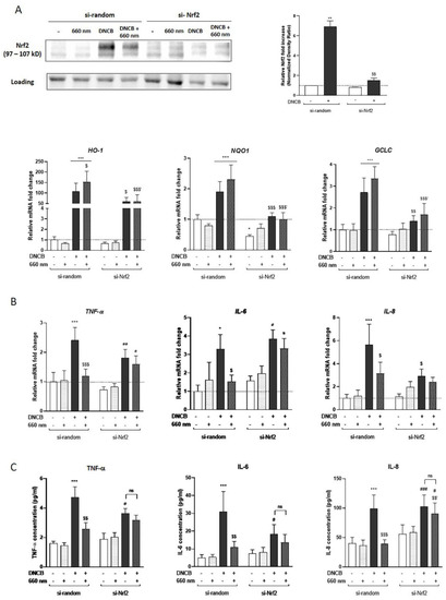 Overall, our results showed that PBM response controlling DNCB-induced pro-inflammatory cytokines and chemokines is, at least partially, dependent on Nrf2.