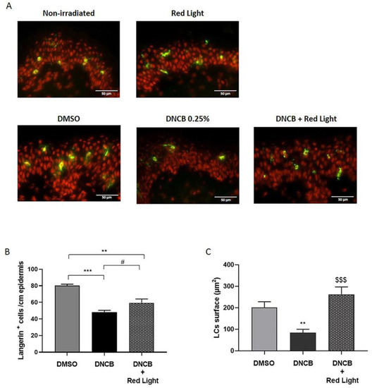 Red light decreases DNCB-induced LCs activation in the epidermis. Human skin explants were topically treated with the excipient (DMSO 20%) or DNCB (0.25% w/v) with or without red light exposure (660 nm, 3 J/cm2, 250 s). (A) Langerin immunostaining was performed on frozen skin sections 24 h after DNCB treatment and revealed by AlexaFluor 488 (green). The nuclei were counterstained using propidium iodide (red). Scale bars represent 50 µm. (B) The absolute number of langerin-positive cells in the epidermis was counted at 2 different zones for the 3 explants of each batch. Histogram represents the mean ± SEM of 6 measures of langerin-positive cells/cm epidermis. (C) Langerin-positive cells total surface was measured by ImageJ software (version 1.8). Histogram represents the mean ± SEM of cell surface of 10 different measures. ANOVA followed by Tukey post hoc test; ** p < 0.01; *** p < 0.001 vs. DMSO-treated control group; # p = 0.06, $$$ p < 0.001 vs. DNCB-treated group.
