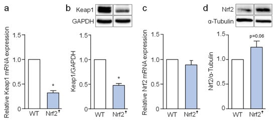 Hypomorphic Keap1 (Nrf2ꜛ) mice showed significantly decreased expression of Keap1 in the kidney at both the mRNA and protein levels (Figure 1a,b). This did not affect Nrf2 gene expression (Figure 1c), which was not expected because Keap1 regulates Nrf2 primarily posttranslationally. However, an increased amount of Nrf2 protein could be measured in the mice (Figure 1d).