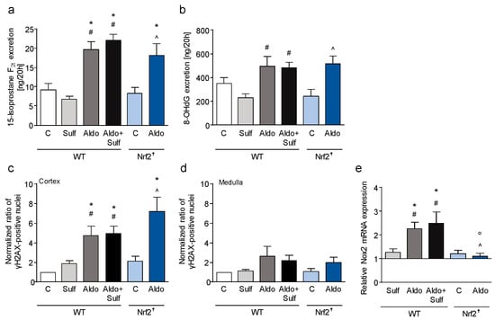 Systemic oxidative stress was determined by the excretion of 15-isoprostane F2t, a marker of lipid peroxidation, and 8-OHdG, a marker of oxidative damage to nucleic bases, in the collection urine of mice. 15-isoprostane F2t was significantly increased in all Aldo-treated animals. Higher 8-OHdG excretion was detected in WT and Nrf2ꜛ mice compared with the WT-Sulf group and the Nrf2ꜛ-C group, respectively (Figure 3a,b). As another reasonably stable marker for oxidative stress, the DNA damage marker γH2AX was quantified on paraffin sections of the kidneys. Here, a localization of damage in renal cortex and medulla is feasible. Compared with the WT-C group, there were approximately twice as many γH2AX-positive nuclei in the renal cortex of Sulf-treated WT mice and in the Nrf2ꜛ-C group (Figure 3c,d). Aldo resulted in a significant increase of 4- and 6-fold in γH2AX-positive nuclei in all three Aldo-treated groups compared with the respective control groups. In the medulla, there was no elevated damage after Aldo treatment. As a possible source of oxidative stress, we examined the change in expression of NADPH oxidase isoform 2, which was significantly upregulated in the two Aldo-treated WT groups (Figure 3e).