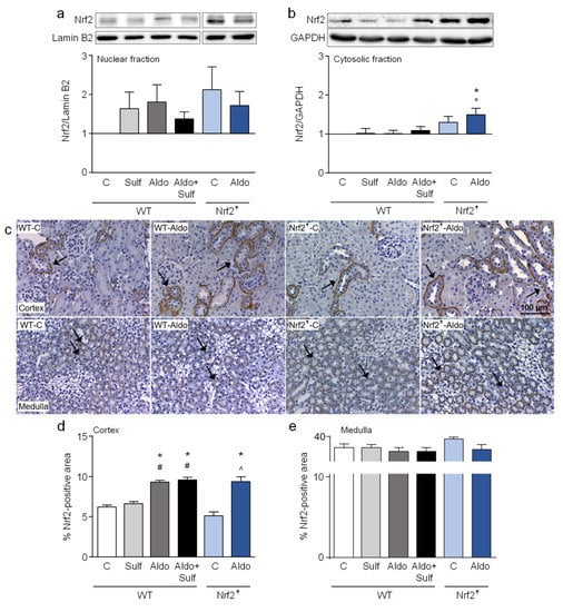 No significant difference in Nrf2 abundance in nuclear and cytosolic kidney samples was observed between groups, except for the Aldo-treated Nrf2ꜛ group (Figure 4a,b). Here, the amount of cytosolic Nrf2 was significantly increased compared with the WT control and the WT-Aldo group. To obtain better local resolution of Nrf2 levels, renal tissue was immunohistochemically stained with an antibody against Nrf2 (Figure 4c–e). A 4- to 8-fold higher expression of Nrf2 was observed in the medulla compared with the cortex, but significantly altered abundance of Nrf2 was observed only in the cortex, increased in all Aldo-treated groups.