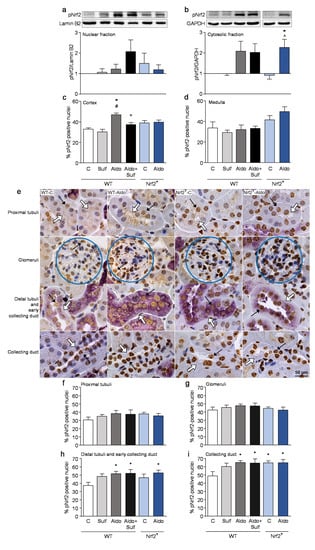 When the phosphorylated form of Nrf2, pNrf2, which is ostensibly regarded as the active form of the transcription factor, is considered, we found its significant increase only in the Aldo-treated Nrf2ꜛ group in the cytosolic fraction (Figure 5a,b). In contrast, in the nuclear and the cytosolic extracts of the Aldo-treated WT mice, interindividual variations prevented the finding of significant changes of pNrf2. Here, immunohistochemical staining revealed a significantly increased amount of pNrf2 only in the cortex of WT-Aldo mice (Figure 5c,d). An even more detailed localization of pNrf2 according to kidney structure or cell type (Figure 5e–i) showed a significant increase in the distal tubule, early and later collecting duct of all Aldo-treated groups and also in the later collecting duct in the Nrf2ꜛ-C group.