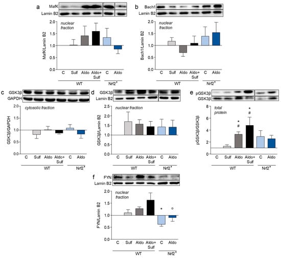 Expression of proteins important for the function of active Nrf2 and of proteins regulating Nrf2 activity in Aldo-infused WT and Nrf2ꜛ mice and control mice after 28 days of treatment. Representative pictures of Western blots and the quantification of band densities measured via ImageJ and related to the nuclear protein lamin B2 (68 kDa) or, in the case of pGSK3β, to non-phosphorylated GSK3β (46 kDa) of (a) nuclear localized MafK (18 kDa), (b) nuclear localized Bach1 (81 kDa), (c) GSK3β (46 kDa) localized in the cytosol, (d) nuclear localized GSK3β (46 kDa), (e) total phosphorylated GSK3β (46 kDa) and (f) nuclear localized FYN (60 kDa) are shown. Aldo: aldosterone, Bach1: BTB and CNC homology 1, basic leucine zipper transcription factor 1, C: control, FYN: Src family tyrosine kinase, GSK3β: glyceraldehyde 3-phosphate dehydrogenase, MafK: musculoaponeurotic fibrosarcoma K, Sulf: sulforaphane, WT: wild-type. Data are shown as mean + SEM, n = 7–8. * p ≤ 0.05 vs. WT-C, # p ≤ 0.05 vs. WT-Sulf, ° p ≤ 0.05 vs. WT-Aldo.