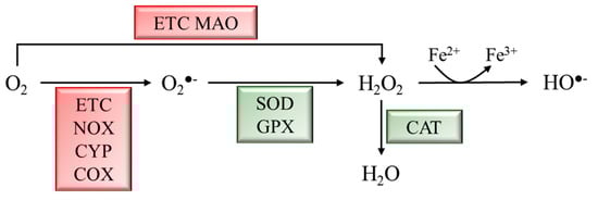 Schematic representation of ROS generation and scavenging. Molecular oxygen (O2) can be partially reduced to superoxide anion (O2●−) by the ETC, NADPH oxidases (NOX), cytochrome P450 (CYP) oxidases, and cyclooxygenases (COX), or to hydrogen peroxide (H2O2) by the ETC and monoamine oxidases (MAO). H2O2 can be converted into hydroxyl radical (HO●−) through the Fenton rection. Enzymatic antioxidants scavenge ROS to produce less reactive molecules. Superoxide dismutase (SOD) and glutathione peroxidase (GPX) convert O2●− to H2O2, which is converted into H2O by catalase (CAT).