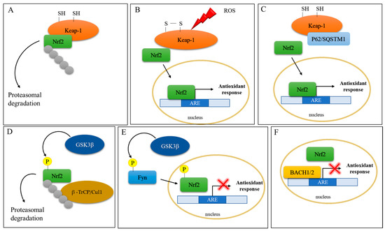 Schematic representation of Nrf2 activation. (A) Under basal conditions, Nrf2 activity is controlled by the cytoplasmic repressor protein Keap1, which sequesters Nrf2 in the cytosol, leading to its ubiquitination and proteasomal degradation. (B) Under oxidative stress conditions, two of the Cys residues in Keap1 become oxidized, impeding the correct orientation of Nrf2 and inhibiting its ubiquitination and degradation. The newly synthesized Nrf2 translocates to the nucleus to induce the expression of antioxidant response genes. (C) P62/sequestosome 1 (p62/SQSTM1) competes with Nrf2 for Keap-1 binding and leads to Nrf2 activation and nuclear translocation. (D) Glycogen synthase kinase-3β (GSK-3β) phosphorylates Nrf2, which is in turn ubiquitinated by β-transducin repeat-containing protein/Cullin-1 E3 ubiquitin ligase (β–TrCP/Cul1). (E) GSK-3β phosphorylates the protein kinase Fyn, which phosphorylates Nrf2, leading to its nuclear export and culminating in inhibition of gene expression (red cross). (F) The BTB and CNC homology transcription factors (BACH1 and BACH2) repress Nrf2 activity (red cross) by competing for ARE binding.