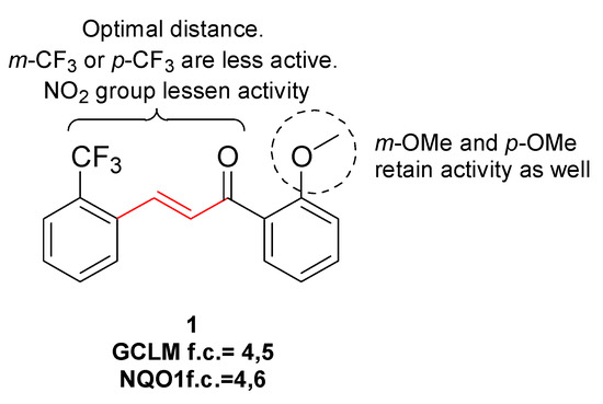 Chalcone contains an electrophilic α,β-unsaturated ketone that can react with the sulfhydryl groups of thioredoxin and cysteine residues in proteins [67]. Therefore, the α,β-unsaturated ketone electrophilic activity is responsible for the various biological activities of chalcones. One of the very first structure–activity relationship (SAR) studies on chalcone-based structures able to activate Nrf2 was reported in 2011 by Kumar et al. [68]. A series of 59 chalcone derivatives was synthesized, and compound 1 emerged as the most interesting molecule (Figure 4).
