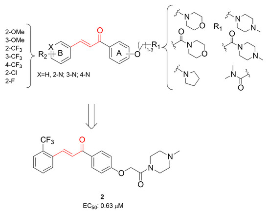 Novel chalcone derivatives as Nrf2 activators. The electrophilic α,β-unsaturated ketone moiety of the chalcone leading scaffold is in red. The introduction of a N-methylpiperazine group into the 4-OH of ring A led to compound 2, a potent Nrf2 activator (EC50 = 0.63 μM) [69].