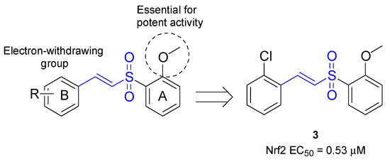 First generation of vinyl-sulfone-based Nrf2 activators. The vinyl-sulfone moiety is in blue. From the structure–activity relationships (SAR) study, it emerged that the presence of an electron-withdrawing group on the B ring favored the Nrf2 activation, while the presence of a 2-methoxyl group on the A ring was essential for the activity. Compound 3 emerged as the most active compound [70].