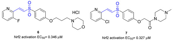 Moreover, considering the potency of morpholine compounds with 3′-F or 3′-Cl on o-pyridine, a 4-piperazine group was introduced instead of the morpholino one (7, Figure 8). Compound 6 demonstrated excellent Nrf2 activation potency, safety, and stability, as well as elicited neuroprotective effects against DAergic neuronal cell death in PD, suppressing microglial activation related to neuroinflammation [72]. In a subsequent study, a series of pyridyl-vinyl-sulfones bearing a halogenated A-ring was synthesized in an attempt to maximize the potency of action of this class of Nrf2 activators [73]. Compound 8 (Figure 9) emerged as the most promising derivative, being able to activate Nrf2 at nanomolar concentrations, with an ameliorated potency of action with respect to the previous developed compounds. Moreover, compound 8 retained positive drug-like properties and an interesting biological profile in both in vitro and in vivo models of PD [73].