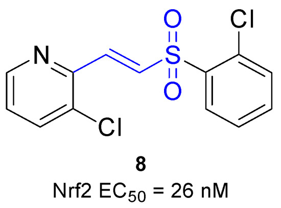Chemical structure of a potent halogenated vinyl-sulfone-based Nrf2 activator. The vinyl-sulfone moiety is in blue. Compound 8 showed potent Nrf2 activation (EC50 = 26 nM) and drug-like properties [73].