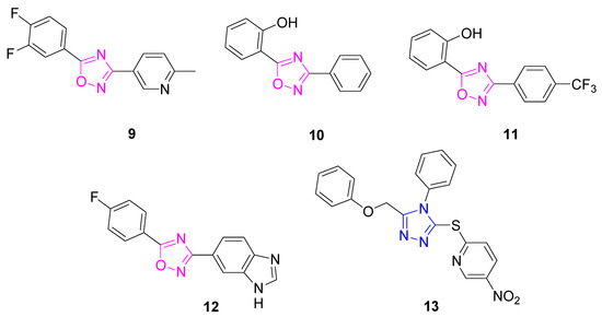 Oxadiazole- and triazole-based Nrf2 activators. The oxadiazole moiety is reported in pink, while the triazole moiety is in blue. These compounds were able to activate Nrf2 nuclear translocation [75,76,77,78].